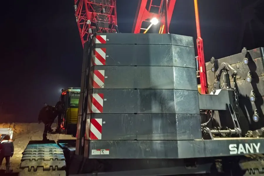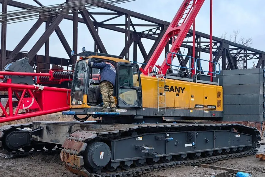 Комплектация: основная стрела длиной - 82 метра, фиксированный гусёк - 31 метр, маневровый гусёк - 52 метра, крюки - 13,5/50/100 тонн.